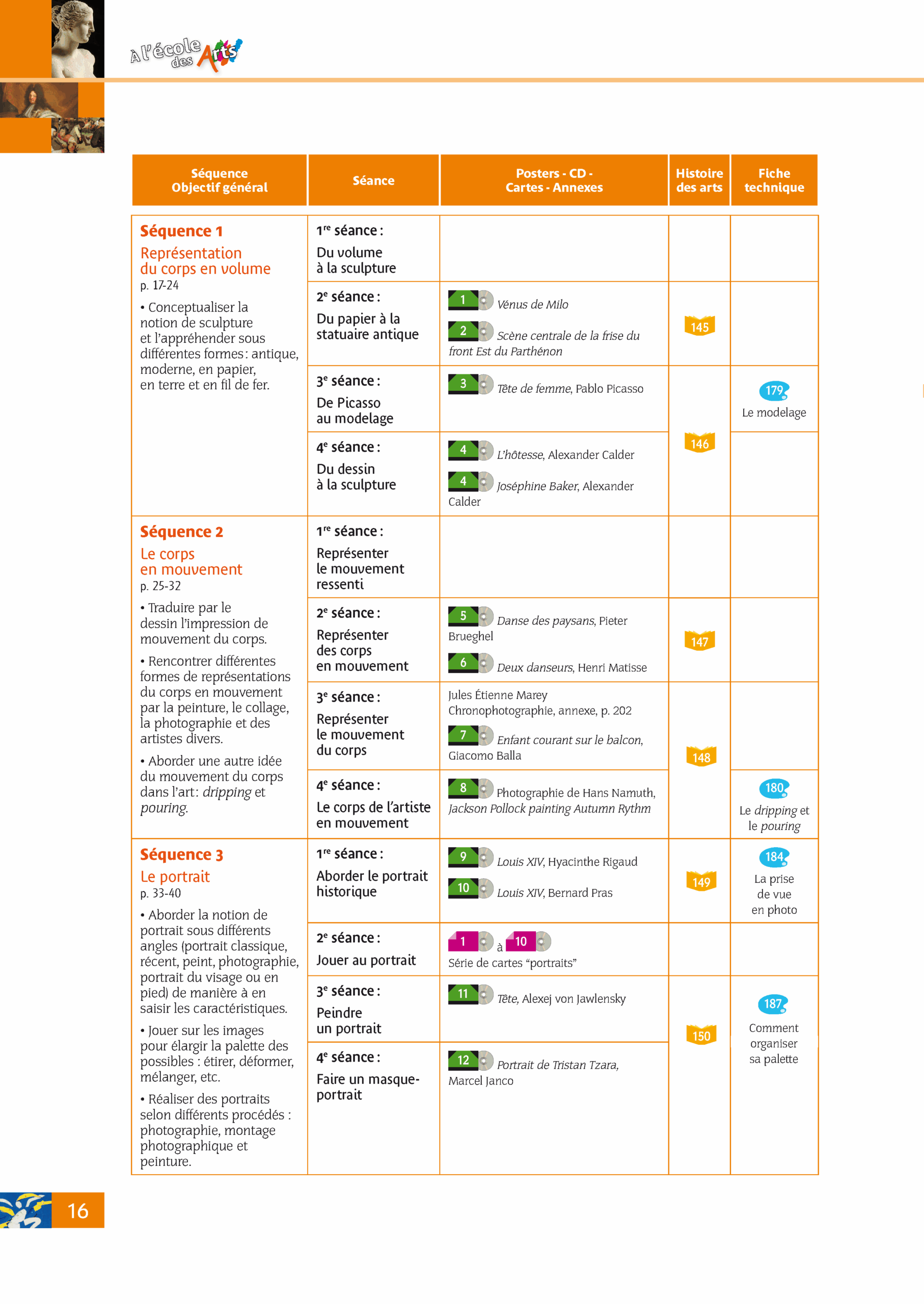 Chaque thème est décliné en trois séquences de pratique artistique, chacune comportant quatre séances basées sur un principe progressif :