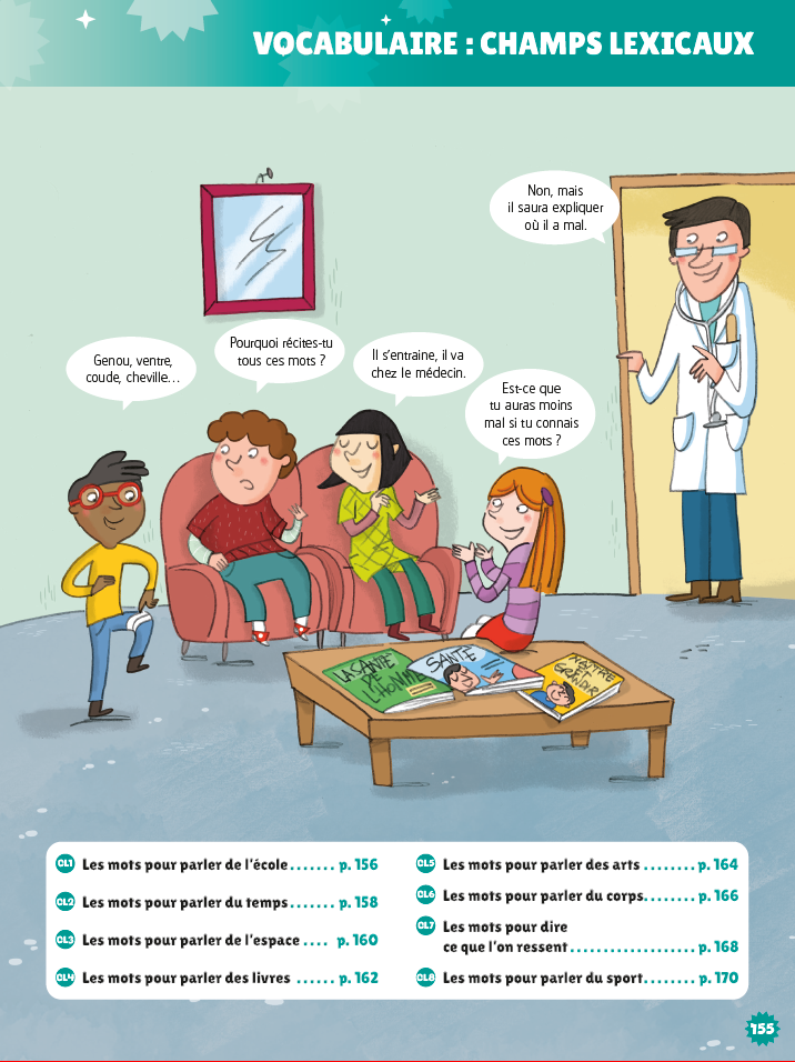 Des doubles pages spécifiques sont consacrées au travail sur les champs lexicaux, renforçant la maîtrise des familles de mots et leur usage.
