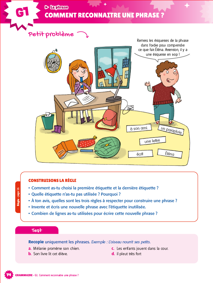 Chaque notion débute par une situation problème, incitant les élèves à observer, manipuler et formuler des hypothèses sur un fait de langue. La règle formelle est proposée à la fin de la leçon. - Test :