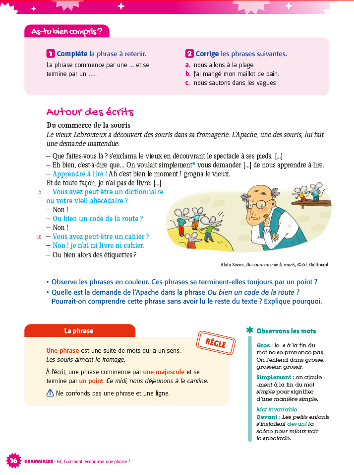 - Réinvestissement : Des activités pour appliquer les notions en contexte, à travers la lecture, la rédaction et les dictées.